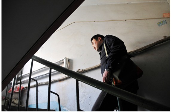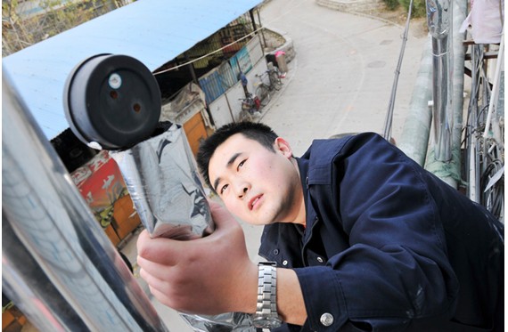 來到11號樓,胡站長并沒有直接進入用戶家,他首先爬上二樓單元屋檐上,檢查了一下進、出單元的壓力表,一切正常后,才來到4樓王大娘家。