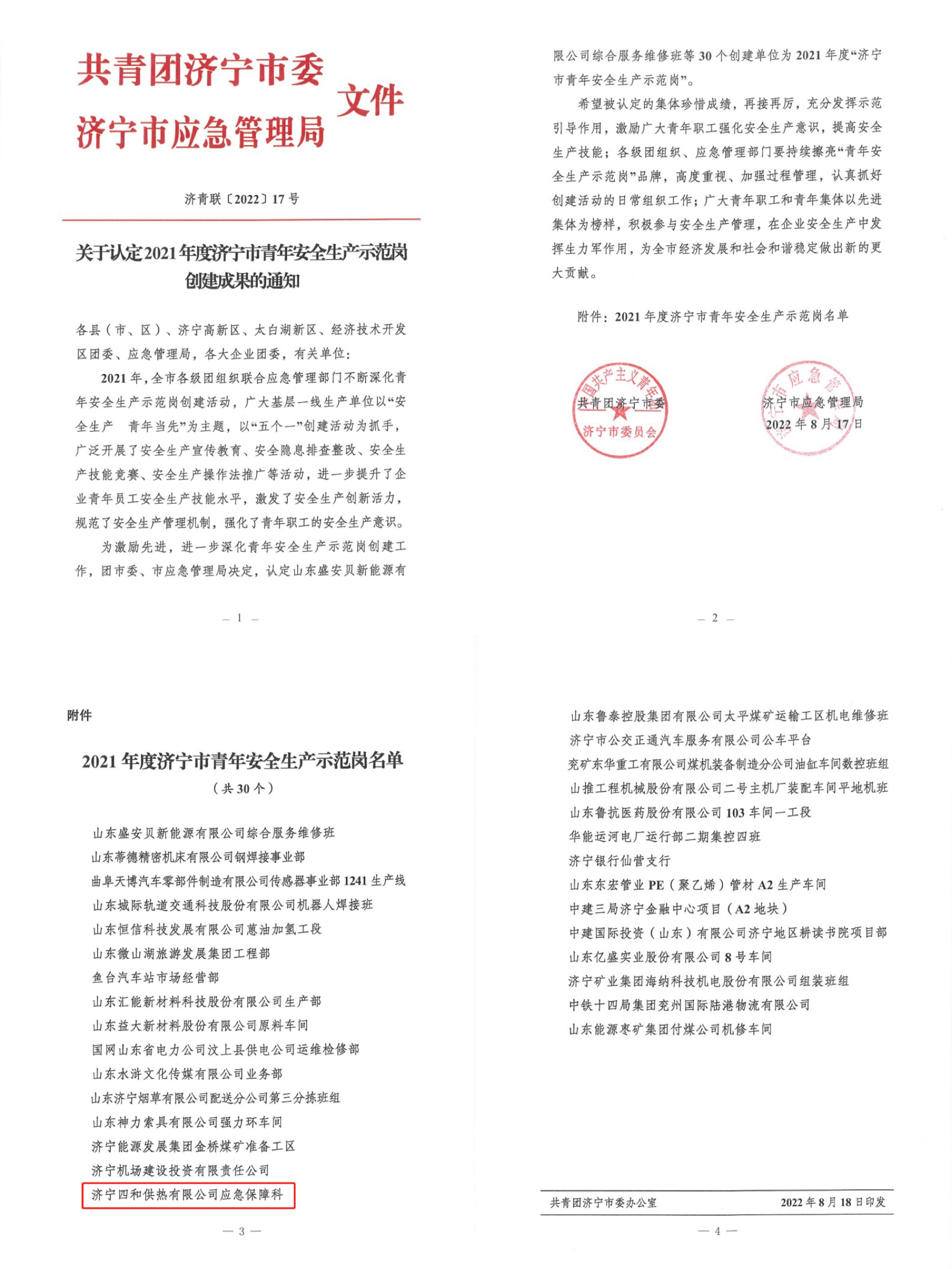 近日,共青團濟寧市委、濟寧市應(yīng)急管理局聯(lián)合下發(fā)了《關(guān)于認定2021年度濟寧市青年安全生產(chǎn)示范崗創(chuàng)建成果的通知》,認定濟寧四和供熱有限公司應(yīng)急保障科為2021年度“濟寧市青年安全生產(chǎn)示范崗”。