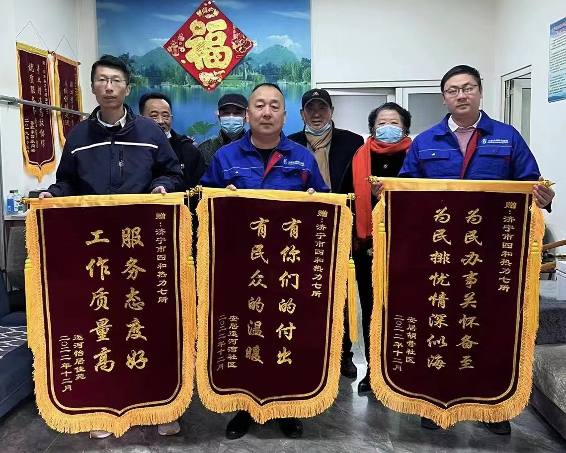 12月8日,胡營回遷一期、胡營回遷二期運(yùn)河灣、胡營運(yùn)河怡居佳苑三個小區(qū)的業(yè)委會代表以及胡營回遷一期唐營黨支部領(lǐng)導(dǎo)專程前往濟(jì)寧四和供熱有限公司供熱服務(wù)七所,將四面鮮紅的錦旗送到所長劉延春手中,感謝始終奮戰(zhàn)在供熱一線的工作人員的辛勤付出。