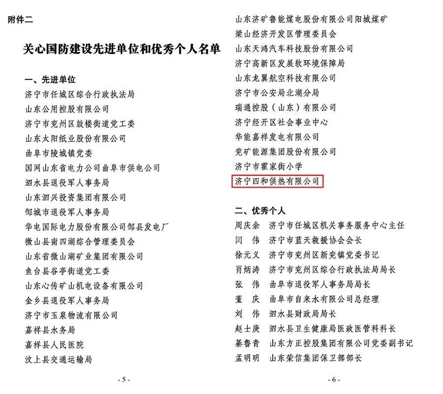 近日,中共濟寧市委辦公室下發(fā)了《關(guān)心國防建設(shè)先進單位和優(yōu)秀個人名單》,濟寧四和供熱有限公司榮獲關(guān)心國防建設(shè)先進單位榮譽稱號。